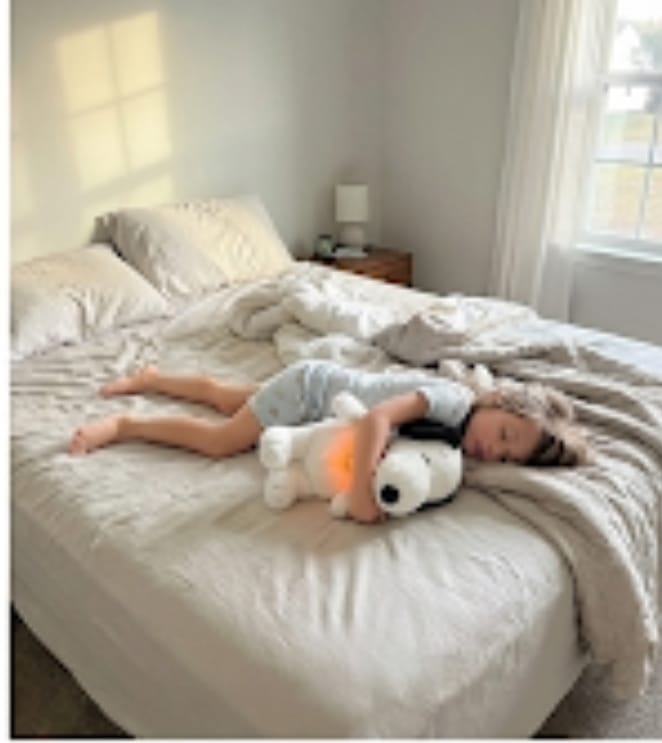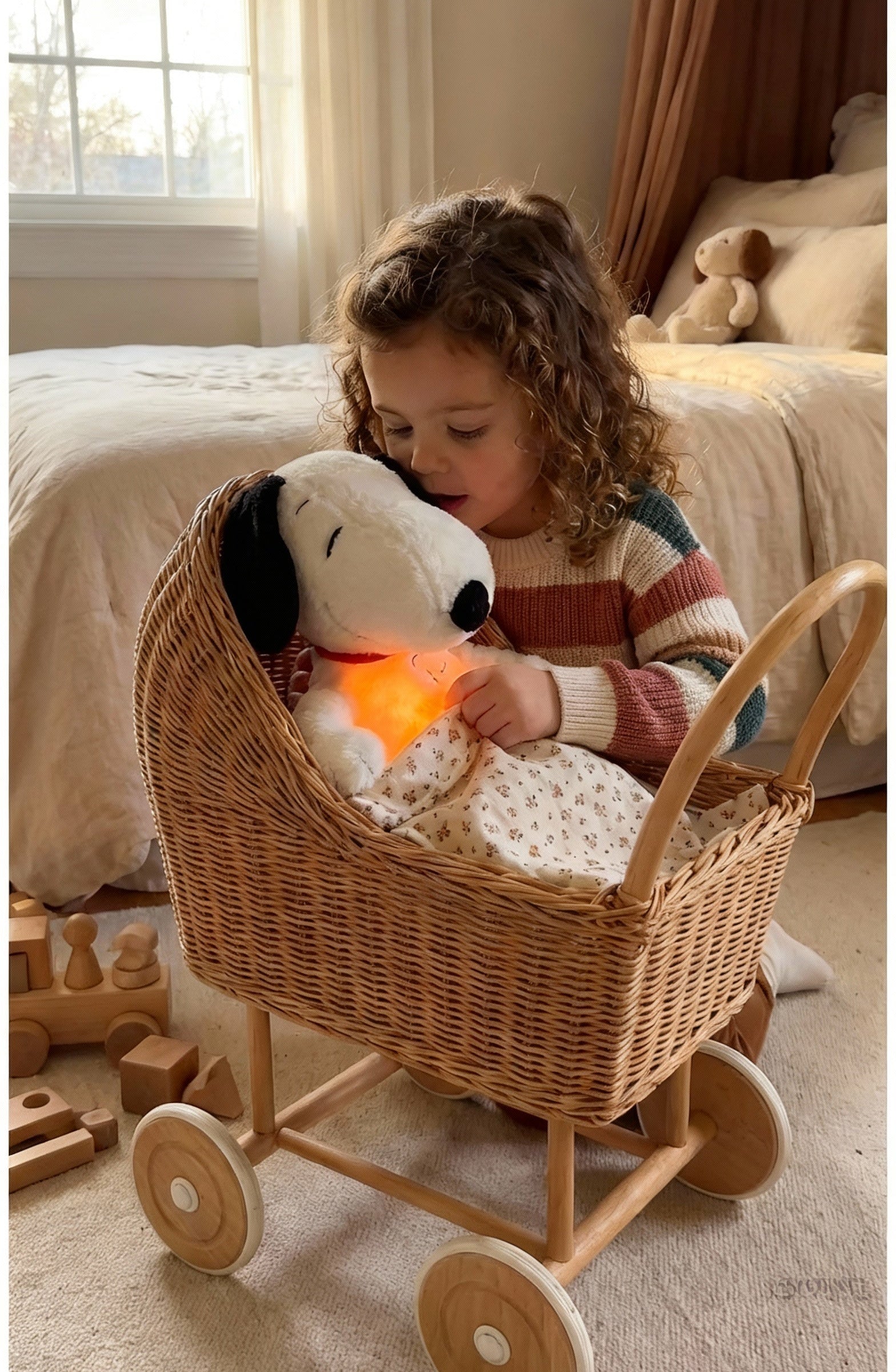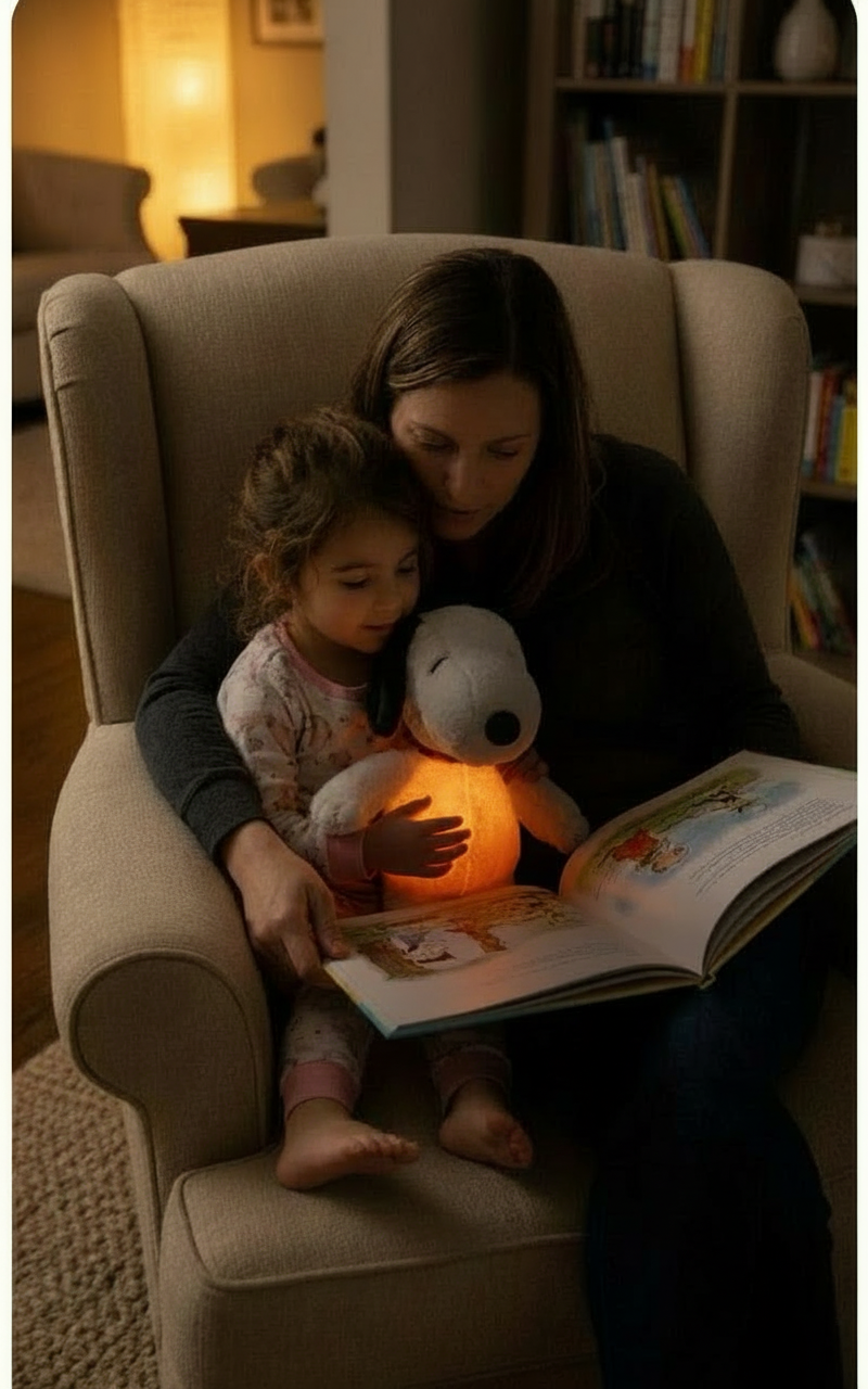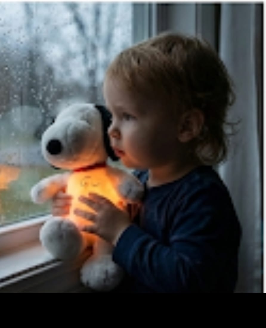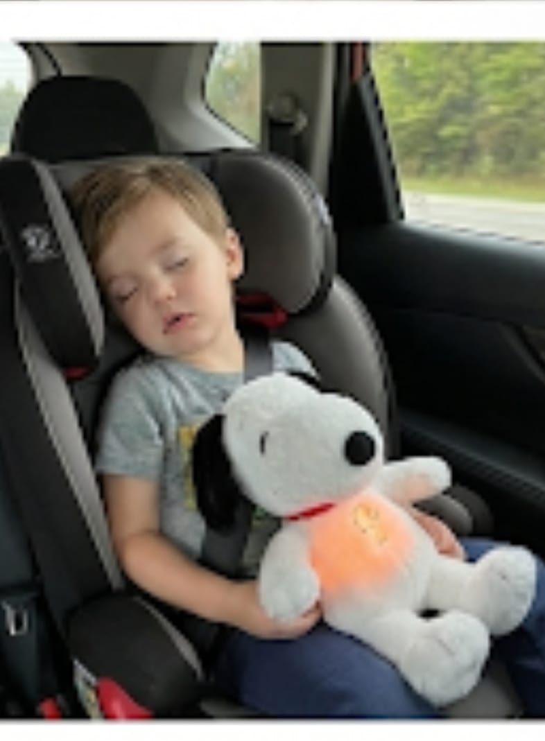 Snoopy to interaktywna maskotka usypiająca, która po naciśnięciu przełącznika w łapce uruchamia kojące funkcje: delikatną imitację oddychania poprzez rytmiczny ruch brzuszka, ciepłe, nierażące światełko w brzuchu oraz łagodną, usypiającą melodyjkę. Całość tworzy poczucie bezpieczeństwa, pomaga dziecku się wyciszyć i spokojnie zasnąć, a po określonym czasie maskotka automatycznie się wyłącza.